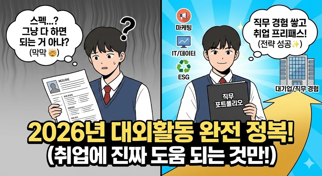 1. 서론: "대외활동, 아무거나 하면 시간 낭비!" 2026년을 앞두고 새해 목표로 '대외활동 합격'을 세운 대학생분들 많으시죠? 하지만 요즘 채용 트렌드가 바뀌었습니다. 단순히 활동 개수를 늘리는 '보여주기식 스펙'은 더 이상 통하지 않습니다. 기업들은 **'실무와 관련된 직무 경험'**을 가진 인재를 원합니다. 그렇다면 수많은 대외활동 중에서 어떤 것이 내 진로에 진짜 도움이 될까요? 오늘은 2026년 주목해야 할 대외활동 트렌드와 함께, 주요 기업들의 활동 시기를 예측해보고 합격을 부르는 지원 전략까지 확실하게 정리해 드립니다.