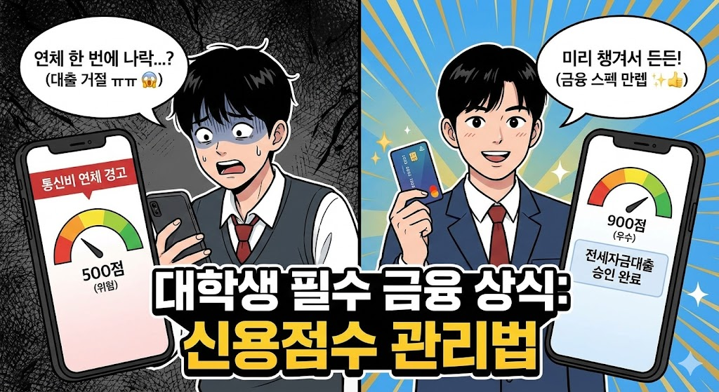1. 서론: 학점보다 중요한 '금융 성적표'가 있다? 대학생 여러분, 학교 성적(GPA) 관리는 열심히 하시죠? 그런데 여러분의 **'금융 성적표'**인 신용점수는 몇 점인지 알고 계시나요? "에이, 난 아직 학생이고 빚도 없는데 무슨 신용점수야?"라고 생각하신다면 큰 오산입니다. 나중에 취업해서 자취방 전세 대출을 받으려거나, 급하게 마이너스 통장이 필요할 때, 혹은 첫 차를 할부로 사려 할 때... 대학생 시절 무심코 연체했던 핸드폰 요금 때문에 대출이 거절되거나 남들보다 훨씬 비싼 이자를 내야 할 수도 있습니다. 오늘은 사회에 나가기 전, 대학생이 꼭 알아야 할 **'신용점수 관리 기초'**와 **'똑똑한 첫 신용카드 사용법'**을 알려드립니다.