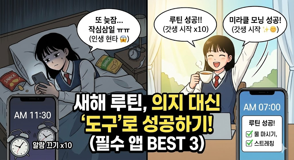 1. 서론: 언제까지 점심에 일어날 건가요? 기말고사가 끝나고 긴장이 풀리니 밤새 유튜브 보고, 해 뜰 때 잠들어서 점심때가 다 되어 일어나는 생활... 혹시 지금 여러분의 모습인가요? 다가오는 2026년 새해, "이번엔 진짜 갓생 산다!"고 다짐하지만, 늘 작심삼일로 끝나는 패턴을 반복하고 있다면 주목하세요. 미라클 모닝은 무조건 새벽 5시에 일어나는 것이 아닙니다. 내가 주도하는 시간을 확보하는 것이 핵심입니다. 오늘은 저 같은 의지박약아도 성공할 수 있었던 현실적인 루틴 만드는 법과 강제로 갓생 살게 해주는 치트키 앱들을 소개합니다.