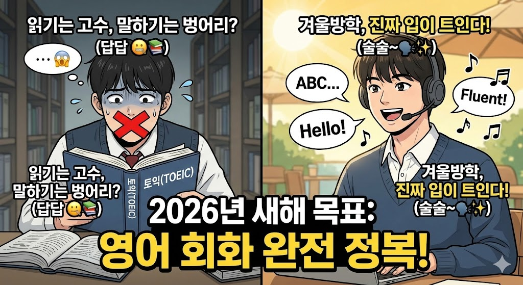 1. 서론: 10년 넘게 배운 영어, 왜 말문이 막힐까? 초중고, 대학교까지 무려 10년 넘게 영어를 배웠는데, 왜 길거리에서 외국인이 말을 걸면 "어... 음... 쏘리..." 하고 도망가게 될까요? 우리는 그동안 눈으로 읽고 문제를 푸는 '시험 영어'만 해왔기 때문입니다. 정작 중요한 '말하기 근육'은 전혀 단련되지 않았죠. 다가오는 2026년, "올해는 진짜 영어로 말 좀 해보자!"라고 다짐하셨나요? 시간이 많은 이번 겨울방학이 '벙어리 영어'를 탈출할 절호의 기회입니다. 취업을 위한 스피킹 시험 점수와 진짜 회화 실력을 동시에 잡을 수 있는 현실적인 전략을 알려드립니다.