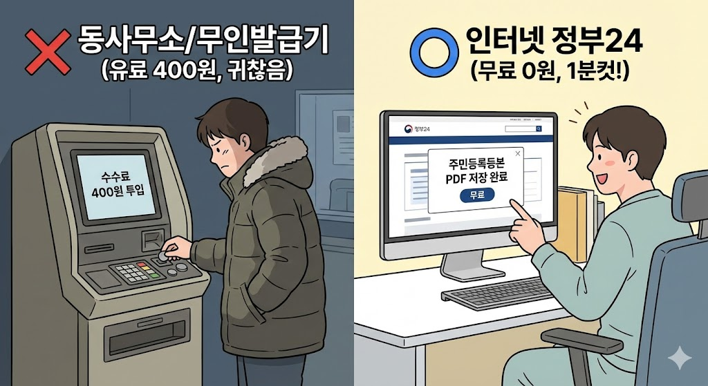 이제 그러지 마세요! 시간 낭비, 돈 낭비입니다. 동사무소 가면 400원, 무인발급기는 200원 내야 하지만, **인터넷(정부24)으로 뽑으면 완전 '공짜(무료)'**입니다. 게다가 종이로 뽑을 필요 없이 깔끔한 PDF 파일로 바로 저장해서 이메일로 쓩~ 보낼 수도 있답니다. 오늘 그 방법을 아주 쉽게 정리해 드립니다.