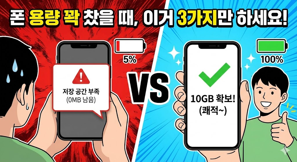 1. 서론: 중요한 순간에 카메라가 안 켜진다면? 맛있는 음식 앞에서, 혹은 아이의 귀여운 순간을 찍으려는데 "저장 공간이 부족하여..." 라는 팝업이 뜨면 정말 짜증 나죠. 그렇다고 소중한 추억이 담긴 사진이나 동영상을 지우기는 싫고... 새 폰을 사자니 너무 비싸고, 지금 쓰는 폰은 점점 느려지고 배터리도 빨리 닳는 것 같아 답답하셨나요? 오늘은 사진 한 장 지우지 않고도 숨어있는 쓰레기 파일을 청소해 용량을 확보하고, 배터리 수명까지 늘리는 특급 노하우를 알려드립니다. 10분만 투자해서 새 폰 같은 쾌적함을 느껴보세요!