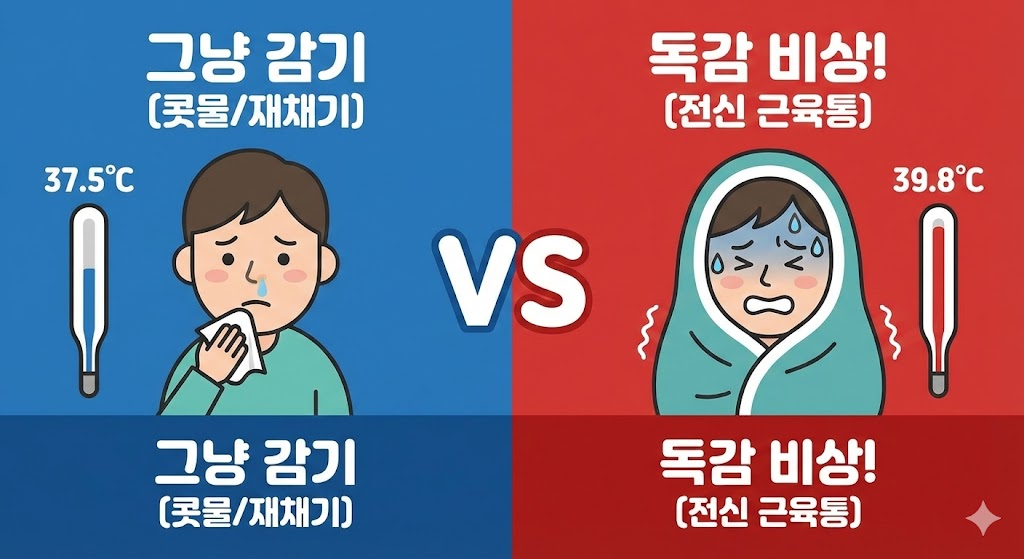 - 독감 (갑자기, 고열): 어제까진 멀쩡했는데, 갑자기 오늘 아침부터 38~40도 이상의 고열이 펄펄 끓습니다. 시작부터 강렬합니다.