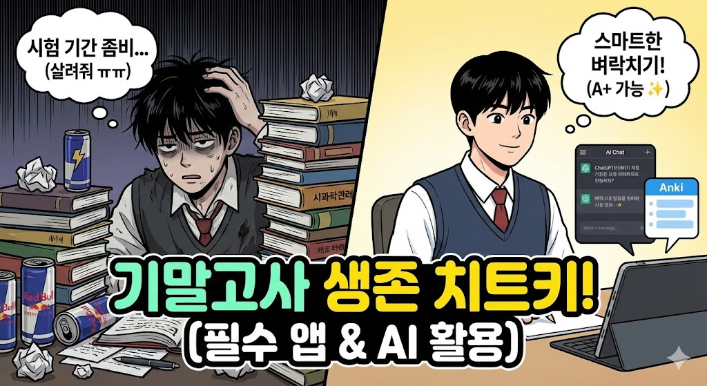 1. 서론: 발등에 불 떨어진 사람? 저요! 🙋♀️🙋♂️ 중간고사 끝난 지 얼마나 됐다고 벌써 기말고사인가요? 과제하느라 진 다 빼고 정신 차려보니 시험이 코앞입니다. 전공 책은 벽돌처럼 두껍고, 교수님이 말씀하신 PPT는 수백 장... "이번 학기는 글렀나?" 하고 포기하려는 순간, 아직 기회는 있습니다! 무작정 밤새며 에너지 드링크를 들이키는 '미련한 벼락치기'는 이제 그만. 오늘은 남은 일주일, 죽어가는 학점을 심폐 소생술로 살려낼 스마트한 벼락치기 치트키(앱/도구) 3가지를 소개합니다.