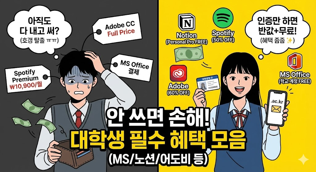 1. 서론: 여러분의 '학생증'은 얼마짜리입니까? 비싼 등록금 내고 학교 다니는데, 수업만 듣고 졸업하기엔 너무 아깝지 않나요? 여러분의 지갑 속에 있는 학생증, 그리고 학교 웹메일 계정(oooo@univ.ac.kr)은 단순한 신분증이 아닙니다. 사회에 나가면 수십만 원을 줘야 하는 유료 서비스들을 무료 또는 반값에 이용할 수 있게 해주는 강력한 **'할인 치트키'**입니다. 오늘은 귀찮아서 미뤄뒀던 대학생 인증 한 번으로 누릴 수 있는 역대급 혜택들을 싹 정리해 드립니다. 졸업하기 전에 다 챙겨 먹어야죠!