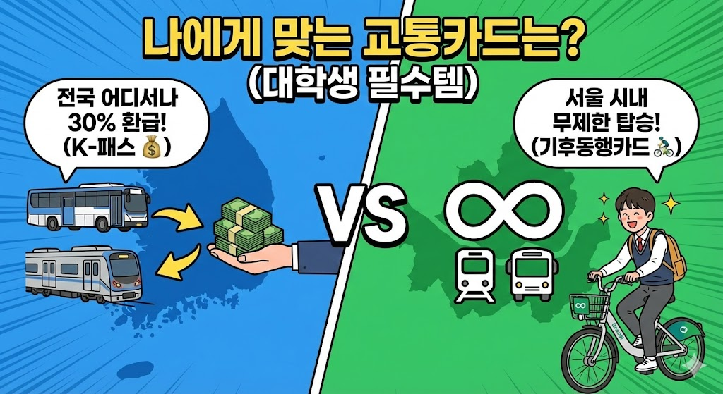 1. 서론: 버스비 1,500원 시대, 숨만 쉬어도 나가는 교통비 매일 학교 가고, 알바 가고, 친구 만나러 가고... 대학생에게 대중교통은 떼려야 뗄 수 없는 존재입니다. 하지만 치솟는 교통 요금 때문에 한 달에 10만 원은 우습게 깨지곤 하죠. "그냥 다니면 손해"라는 말이 나올 정도로, 정부에서 교통비를 팍팍 지원해주고 있다는 사실 알고 계셨나요? 오늘은 헷갈리는 **'K-패스'**와 '기후동행카드' 중 나에게 딱 맞는 카드를 골라 교통비를 최대 30% 이상 아끼는 방법을 알려드립니다.